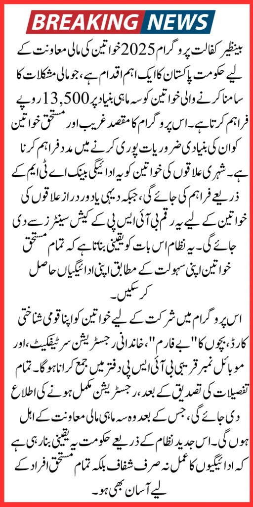 The Benazir Kafaalat Program 2025 is a lifeline for women across Pakistan, providing much-needed financial assistance to help them meet their basic needs. With a payment amount of Rs. 13,500 distributed quarterly, this program supports the government’s commitment to uplifting low-income families and ensuring financial inclusion for women.