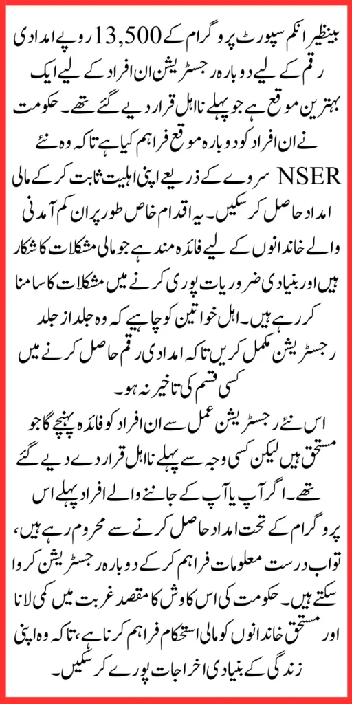 Individuals who were previously disqualified from the Benazir Income Support Program can now reapply by following specific steps to regain eligibility for the 13,500 rupee payment.