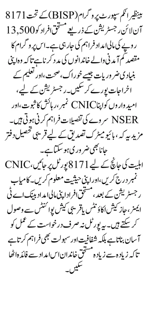 If you meet these criteria, you are eligible to receive the 13,500 payment. However, you must verify your eligibility through the BISP 8171 web portal or visit your nearest Tehsil office for registration.