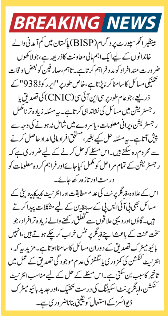 BISP Error Code 938 Issue BISP Error Code 938 The Benazir Income Support Program has been a lifeline for millions of low-income families in Pakistan, providing them with much-needed financial support. However, many users face challenges when trying to access their payments, especially due to error code 938. This article explains what the error means, why it occurs, and how beneficiaries can resolve it to receive their payments without interruption.